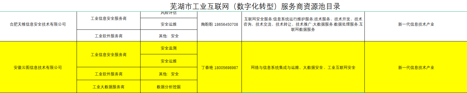 ? ? ? ? ? 近日,蕪湖市經(jīng)濟和信息化局發(fā)布了關(guān)于公布蕪湖市工業(yè)互聯(lián)網(wǎng)(數(shù)字化轉(zhuǎn)型)服務(wù)商資源池目錄,安徽云圖成功入圍了工業(yè)信息安全服務(wù)商、工業(yè)軟件服務(wù)商、工業(yè)大數(shù)據(jù)服務(wù)商三大方向!