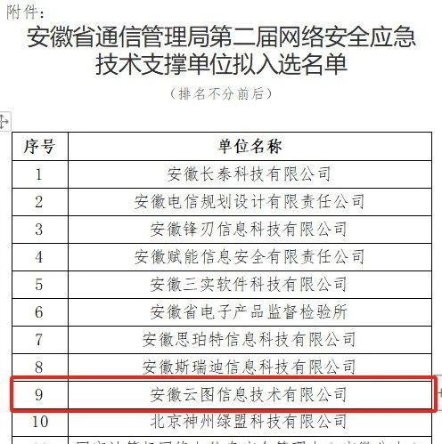 7月19日,我司成功入選安徽省通信管理局第二屆網(wǎng)絡(luò)安全應(yīng)急技術(shù)支撐單位。我司憑借豐富的技術(shù)積累和實(shí)踐經(jīng)驗(yàn),已相繼入選蕪湖、宿州、滁州等多地網(wǎng)絡(luò)安全應(yīng)急支撐單位。未來(lái)我司也將充分利用自身優(yōu)勢(shì),不斷提升網(wǎng)絡(luò)安全應(yīng)急能力,為保障網(wǎng)絡(luò)安全做出更大的貢獻(xiàn)。
